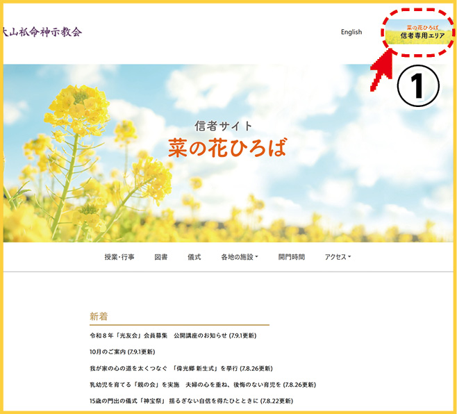 ①信者サイトで、「菜の花ひろば 信者専用エリア」をクリック
