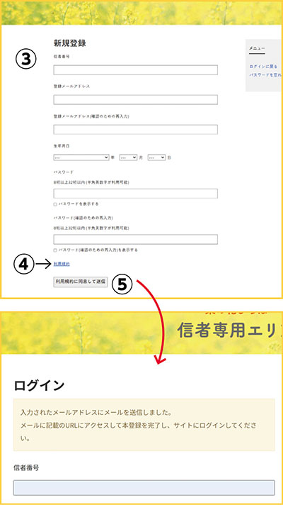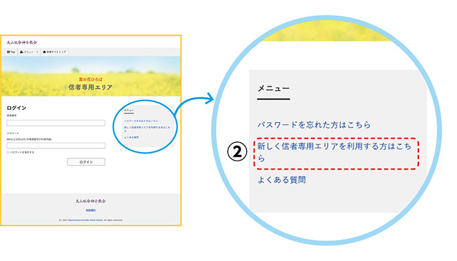 ②「ログイン」画面で、メニューの新しく信者専用エリアを利用する方はこちらをクリック