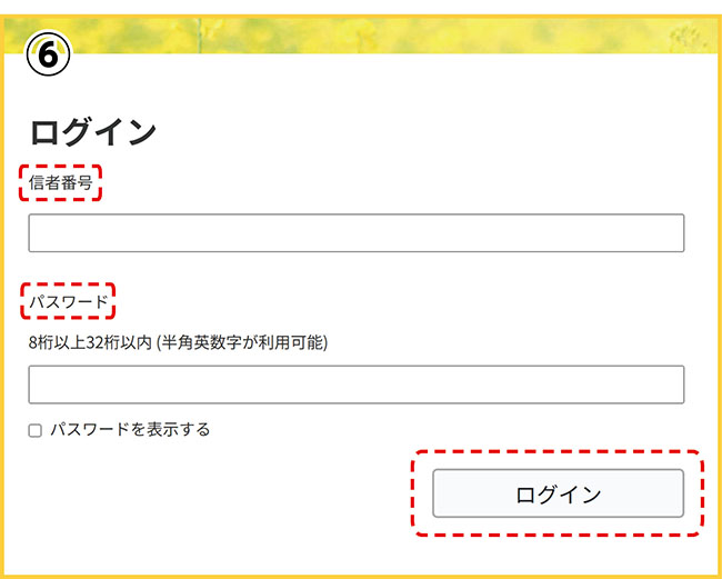 「菜の花通信」が届く方は、「菜の花ひろば 信者専用エリア」への登録ができています。信者番号とパスワードを入力するだけで、いつでも閲覧可能です。パスワードが分からない場合は再発行できます(手続き方法はこちらのQへ)。