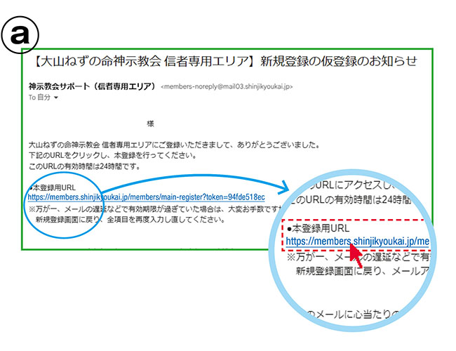 「【大山ねずの命神示教会 信者専用エリア】新規登録の仮登録のお知らせ」のメッセージを開き、本登録用URLを24時間以内にクリック