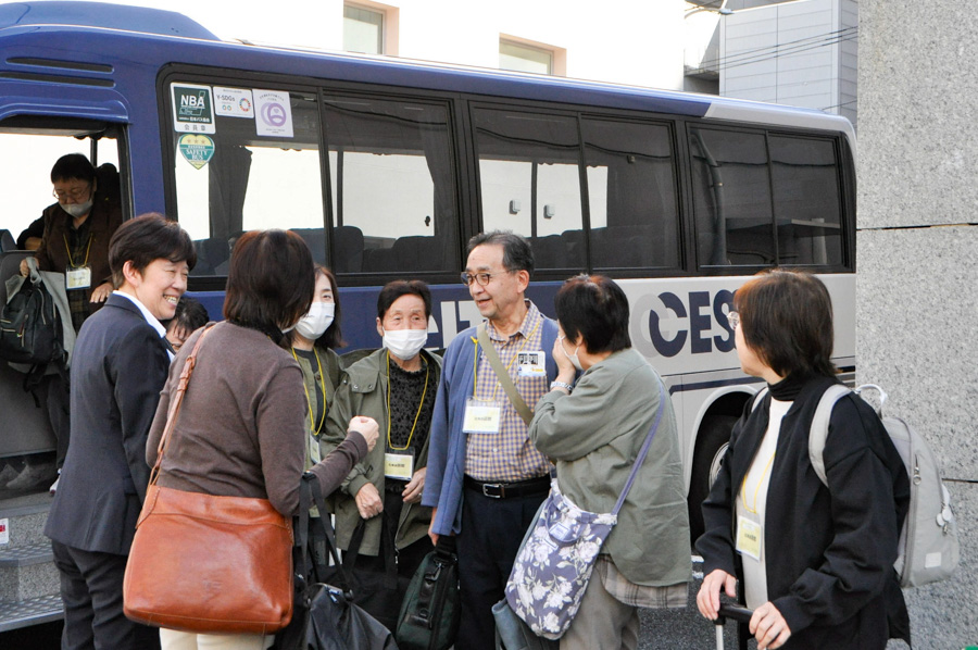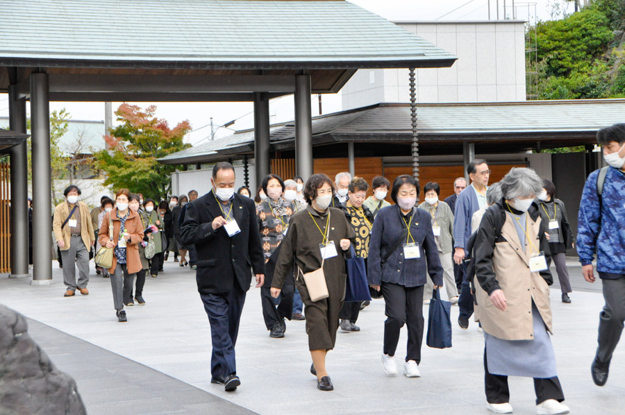 昨年「地方会場の日」で知り合った仲間や、職員との再会に、あちらでもこちらでも歓声が。初めて訪れる神総本部にわくわくする人、念願だった家族との参拝がかない、喜びをかみしめる人…。それぞれの思いを胸に、到着後、まずは真実の光会館へ向かいました。ご開扉された神殿では、「神魂のご存在が、この上なく間近に感じられた」との声も。心行くまで参拝した後は、光寿会館で楽しいひとときを過ごし、横浜市西区戸部町にある宿泊処へ。神示教会発祥の地に立つ建物で、身も心も安らぐ一晩を過ごしました。