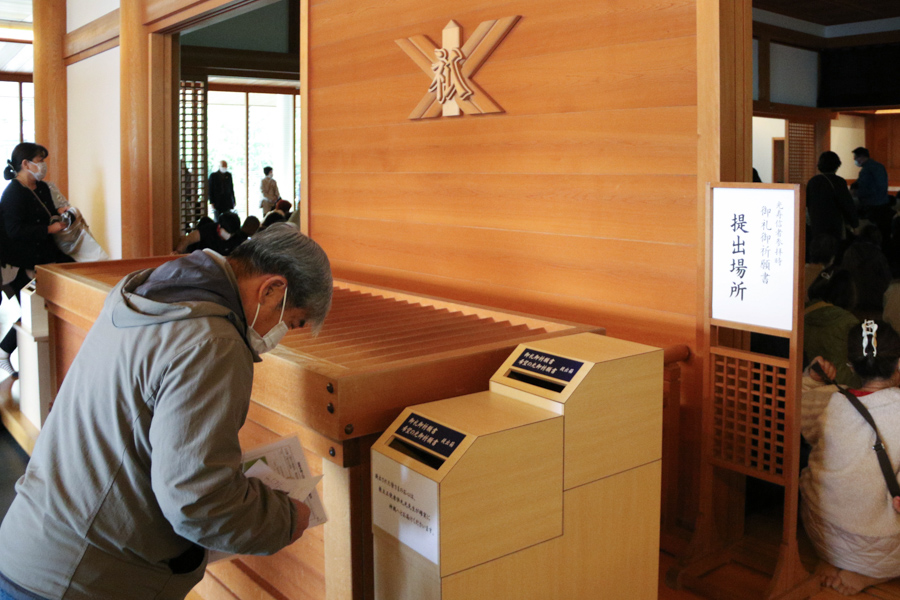 最後は、真実の光会館での「愛礼の儀」に参列。今年味わったご守護への御礼や自身の成長をつづった「御礼御祈願書」を提出し、深まった感謝、膨らんだ喜びを各人が届けました。