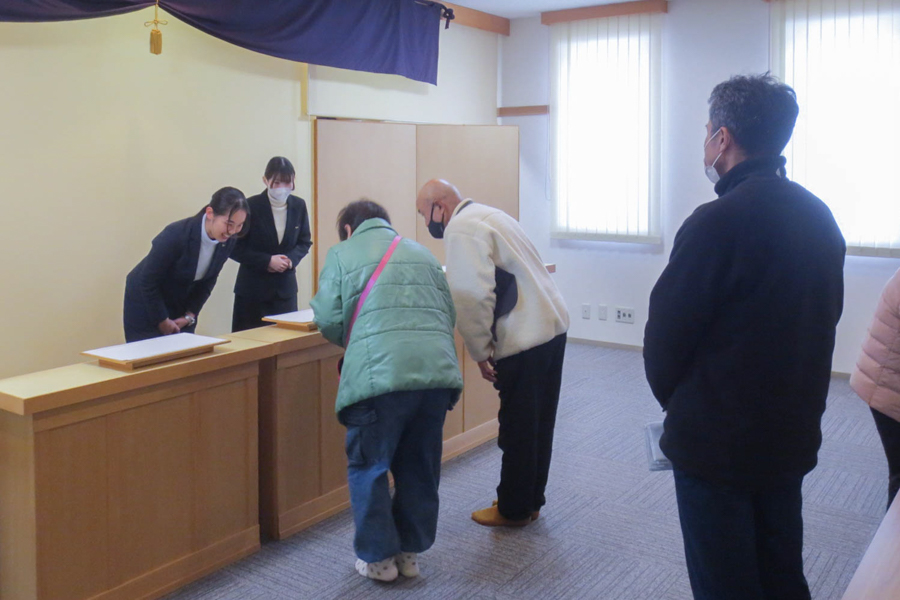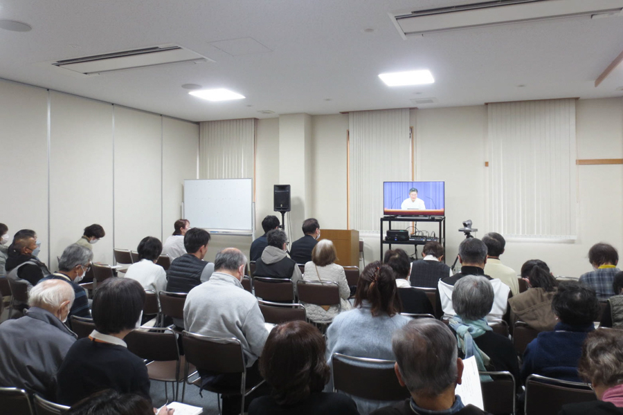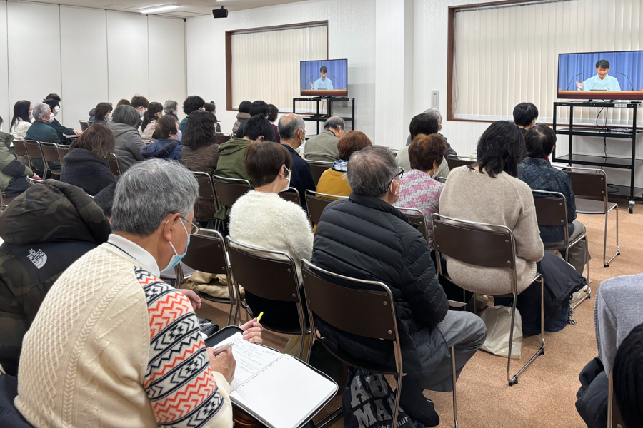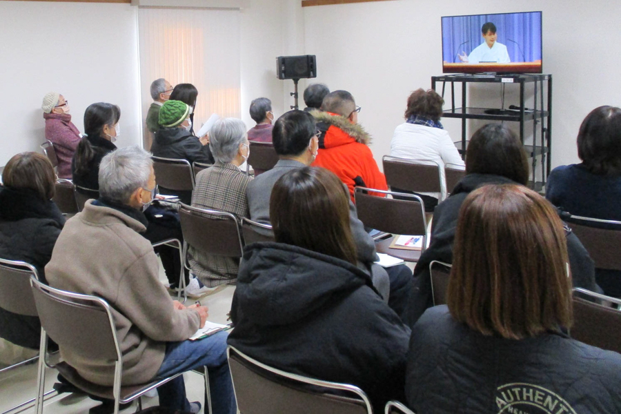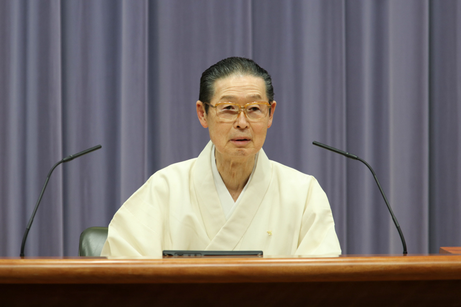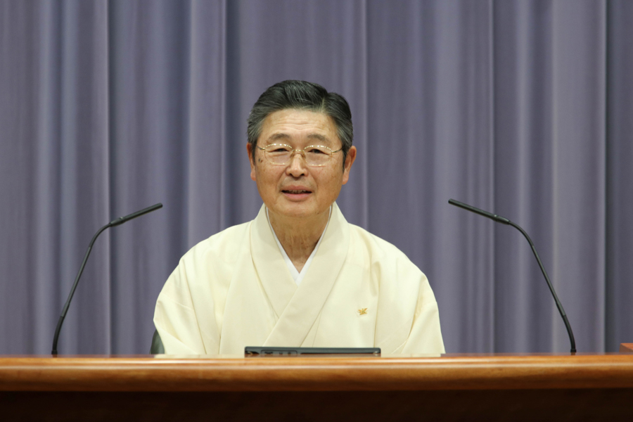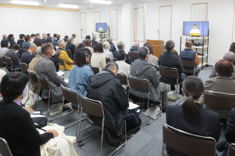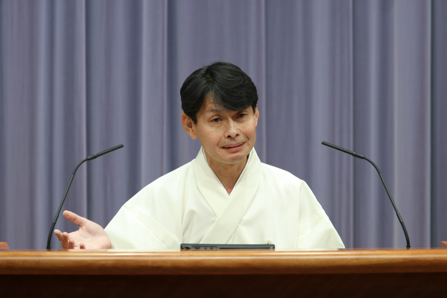 教主正使者供丸光先生は、ことしがどのような年で、どう心を高めていけばよいのかを、神示を基にご指導くださいました。自分では「正しい」と思っていても、時代の流れから外れていれば、成果は出ません。だからこそ、周りを思い、心を重ね、「調和」して生きられるように“人柄”を磨くこと。その実践は、人間関係の基本となる家庭から――。新たな年も教えに生きる決意が、それぞれの胸に湧き上がりました。