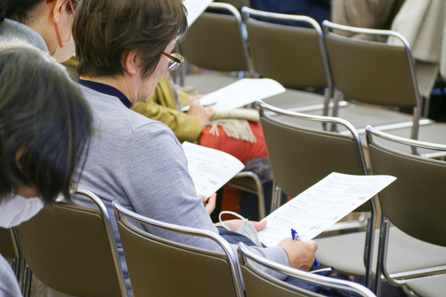 実際のご逝去から納玉(納骨)までの流れは、「玉納奉寿(葬儀)申し込みのご案内」(PDF)を基に確認。大事な家族を送るために一番合った行い方は…、自分のときは…と考えながら、丁寧にメモを取る参加者たち。「まず、神示教会にご一報いただければ、職員が寄り添い、ご案内します」との言葉に、安堵(あんど)の表情を浮かべていました。