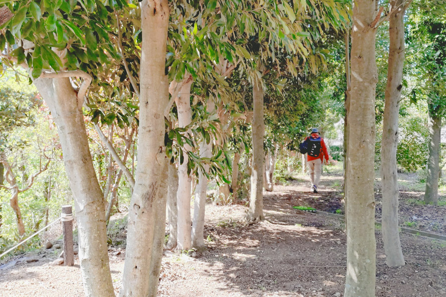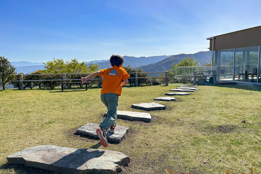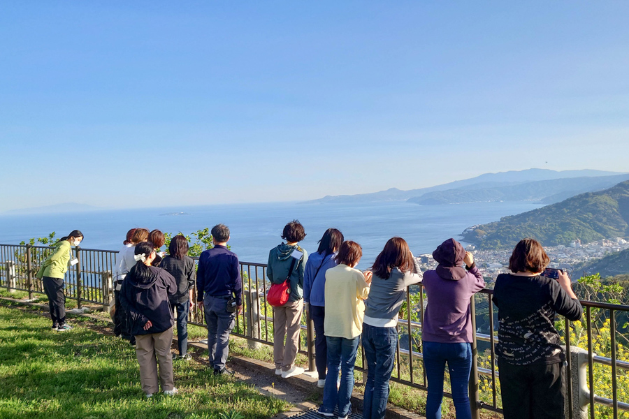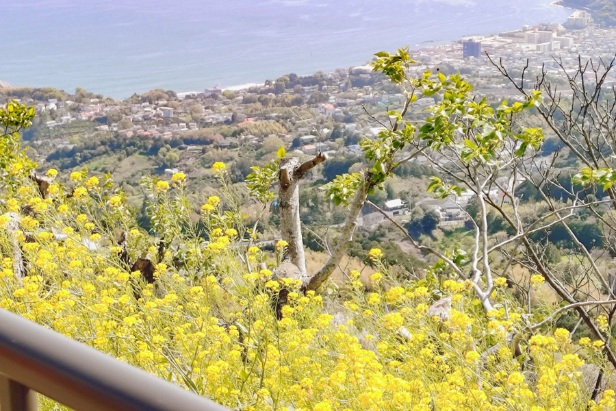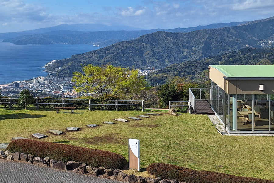 遊歩道を進んだ先の広場では、眼下に広がる相模灘や山並みも、上からとはひと味違った印象に