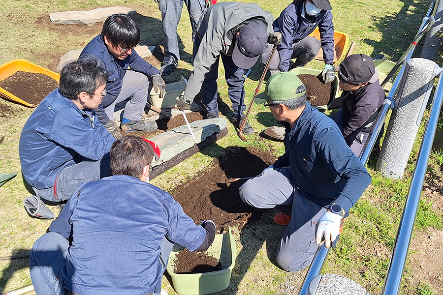 「皆さまに、偉光郷で充実した時間を過ごし、ご家族との縁を深めていただきたい」。その一心で始まった遊歩道造り。お休み処の隣に職員が手作りした階段を皮切りに、ことしの3月には、見晴らしの良い広場までつながりました。4月8日と9日には、階段に続く芝生に「飛び石」を設置。使用したのは、もともと広場にあった石です。大きい物は、8人がかりで運びました。