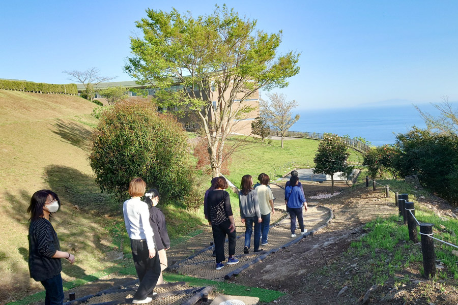 家族で参拝した方、研修で訪れた方々が、思い思いに散策しています。「景色がすてき!」「風が気持ちいい」。どなたもが、自然豊かな偉光郷で、野鳥のさえずりや、澄んだ空気を満喫。お越しの際には、ぜひ最高の癒やしを味わわれてください。